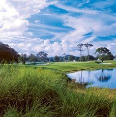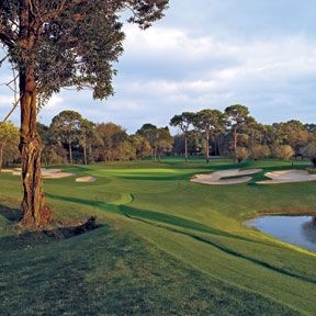 A dogleg par-5 at which you'll have a hard time believing you are in Florida. The tee is surrounded by tall pines, with a lake in the distance that serves as a water hazard for the second shot. The green sits atop a hill. The challenge is putting the scenery out of your mind as you play the hole. The Island course is one of four at the resort.